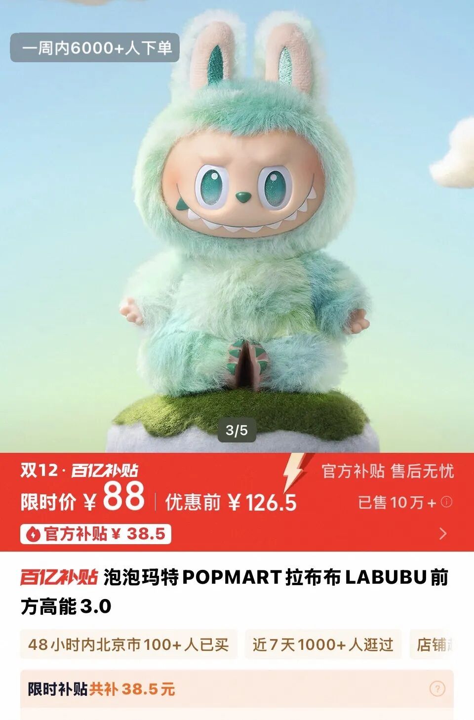 对此,消费市场的确给出了更直接的答案。LABUBU一娃难求的局面已不再常见,二手平台上的价格趋向正常,热门包挂LABUBU“前方高能3.0”甚至还加入了淘宝百亿补贴,88元即可购得一只。