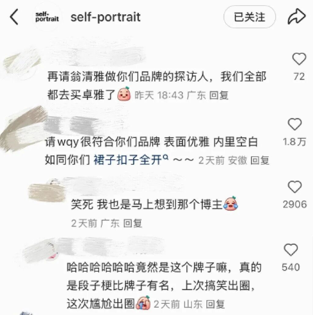 面对直播翻车与质量质疑,self-portrait站在了十字路口。品牌长期积累的高端形象与消费者信任,很可能因一次次“翻车”事件而被消磨。